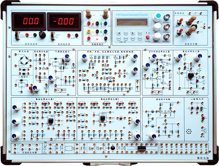模擬電路實(shí)驗(yàn)箱由鋁木合金箱體、高性能線性電源、和實(shí)驗(yàn)電路板組成。其中實(shí)驗(yàn)電路采用固定功能模塊方式,電路原理和元器件符號(hào)清晰,實(shí)驗(yàn)用元器件可以焊裝在線路板的反面,安全可靠,不易損壞,也可以裝在線路板的正面,元件直觀可見,感性認(rèn)識(shí)強(qiáng),正面還有實(shí)驗(yàn)電路原理圖,使學(xué)生在實(shí)驗(yàn)時(shí)對(duì)原理一目了然。