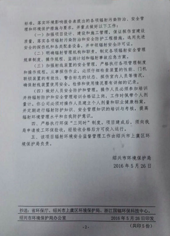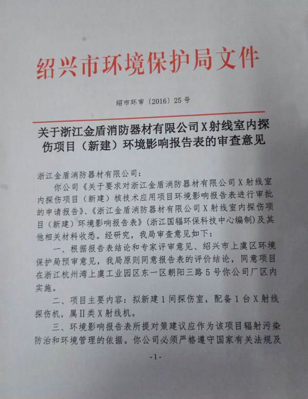 2016年5月26日,紹興市環(huán)境保護(hù)局同意我司(浙江金盾消防器材有限公司)X射線室內(nèi)探傷項(xiàng)目(新建)的環(huán)境影響報(bào)告。 該項(xiàng)目的報(bào)告審批通過(guò)后,X射線探傷室將步入正常工作。公司所生產(chǎn)的消防設(shè)備進(jìn)行無(wú)損檢驗(yàn)后,從而保證產(chǎn)品的質(zhì)量與生產(chǎn)的安全。